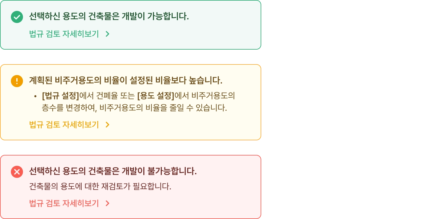 법규 박스: 기획설계 결과가 법적으로 적합한지 시각적으로 구분됩니다.