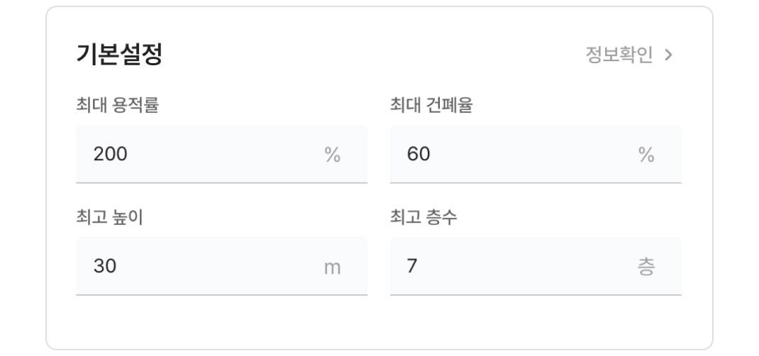 용적률, 건폐율, 높이, 층수 등의 항목을 사용자가 직접 조정할 수 있으며, 입력값을 삭제하면 초기 기본 설정으로 복귀합니다.