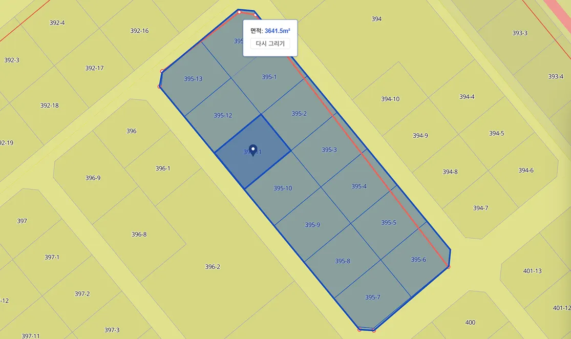 완료하면 그려놓은 범위 안의 필지와 도로가 한 번에 선택됩니다.