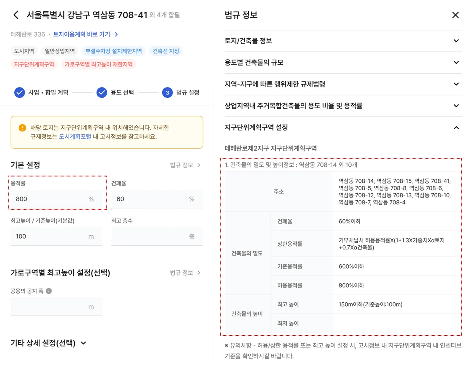 법규 검토 화면에 진입하면 ‘법규’ 정보가 자동으로 표시되며, 검토 중인 주소에 대한 건축물 밀도와 높이 정보를 바로 확인할 수 있습니다. 또한, 용적률은 자동으로 해당 지구단위계획의 허용용적률을 기준으로 입력되어, 신속하게 규모 검토를 진행할 수 있습니다.