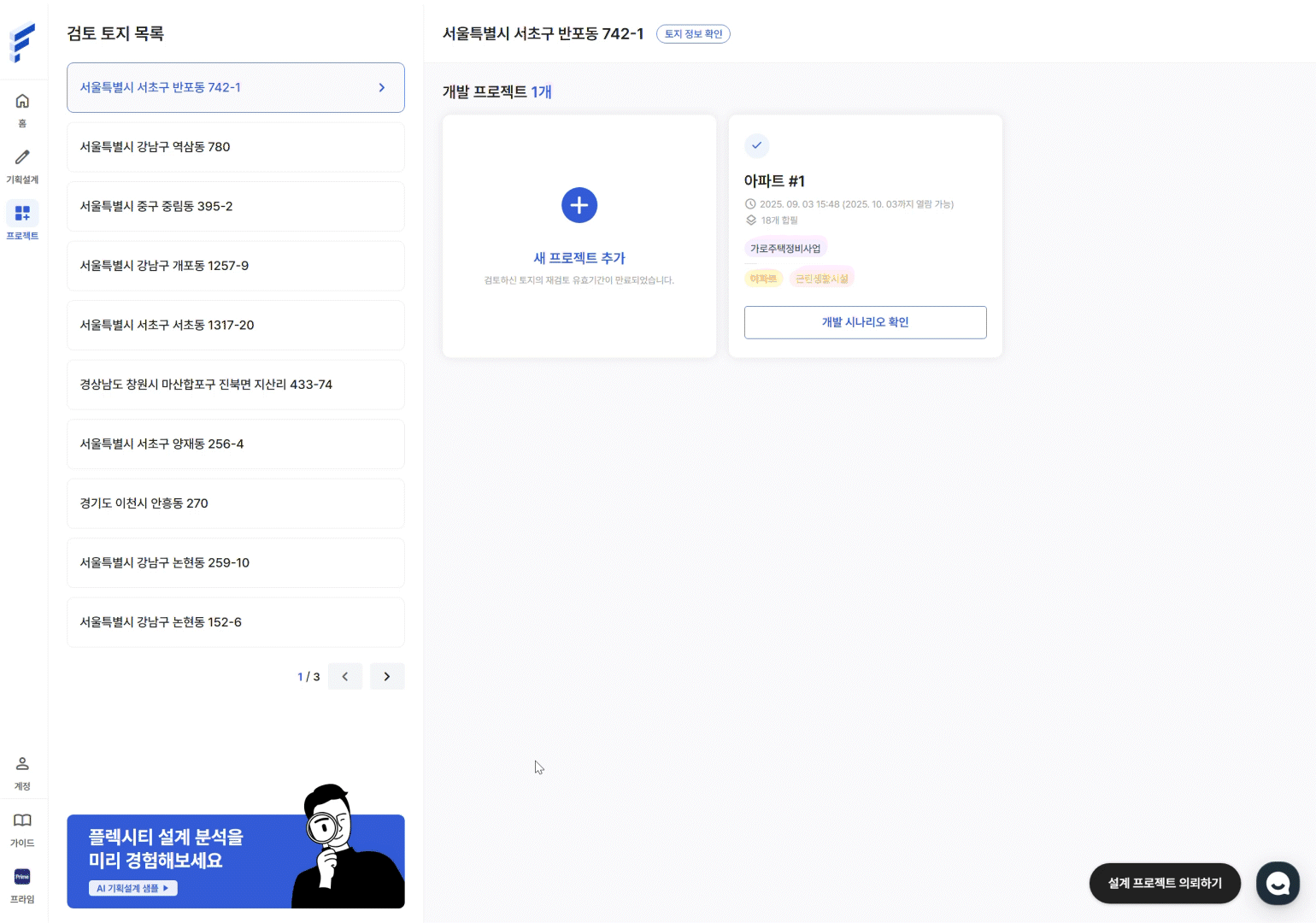 다양한 유형의 개발 시나리오와 분석 리포트를 통해 플렉시티의 AI 기획설계와 사업성 분석 프로세스를 미리 체험할 수 있습니다.