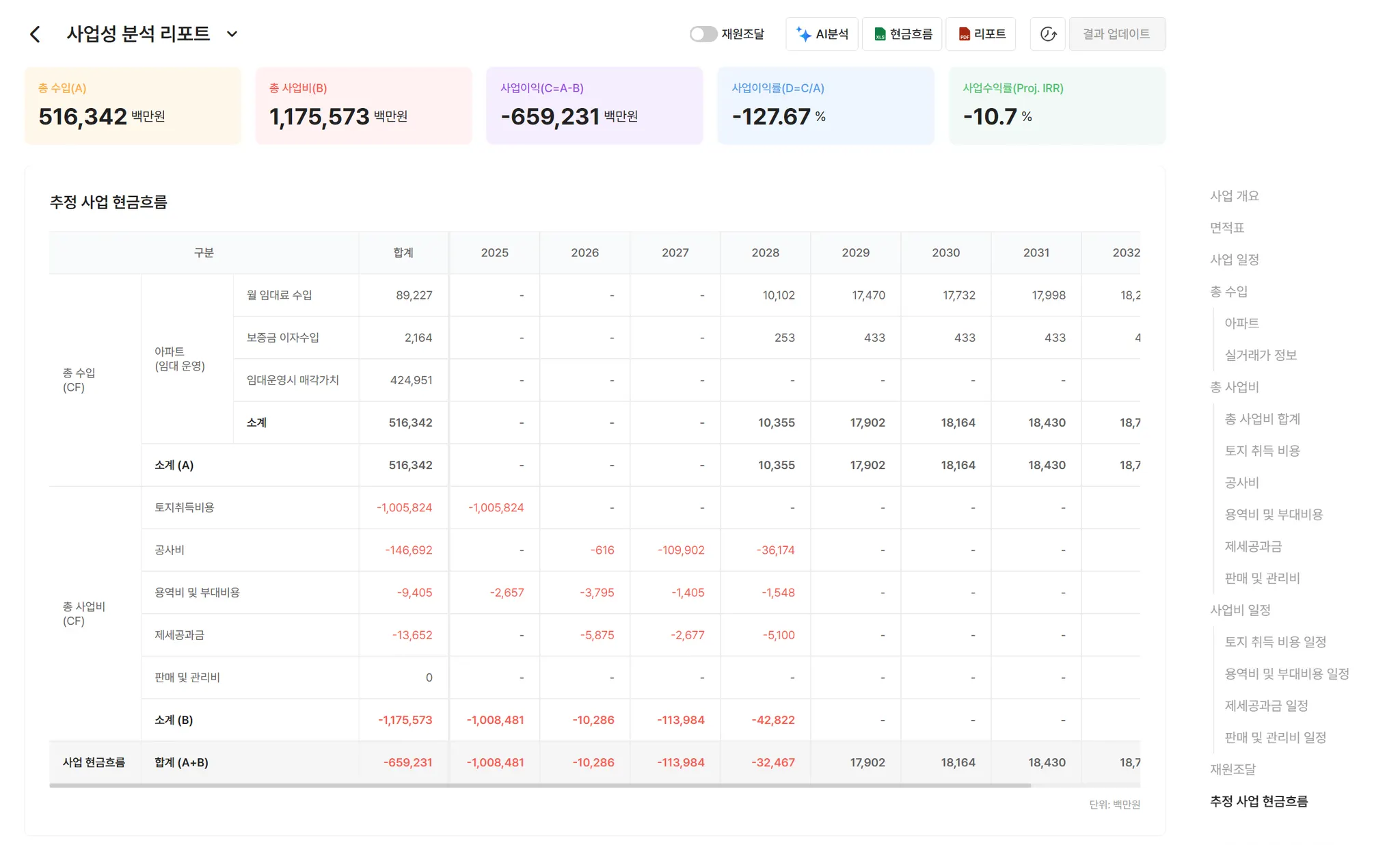사업성분석 리포트에서는 면적표, 사업일정, 총 수입, 총 사업비, 사업비일정, 재원조달 구조, 추정 현금흐름까지 확인할 수 있습니다.