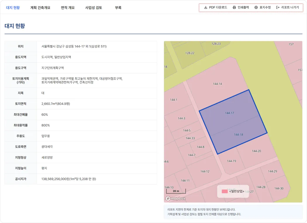 면적, 용적률, 용도 등 규모 판단에 중요한 지표를 확인할 수 있습니다.