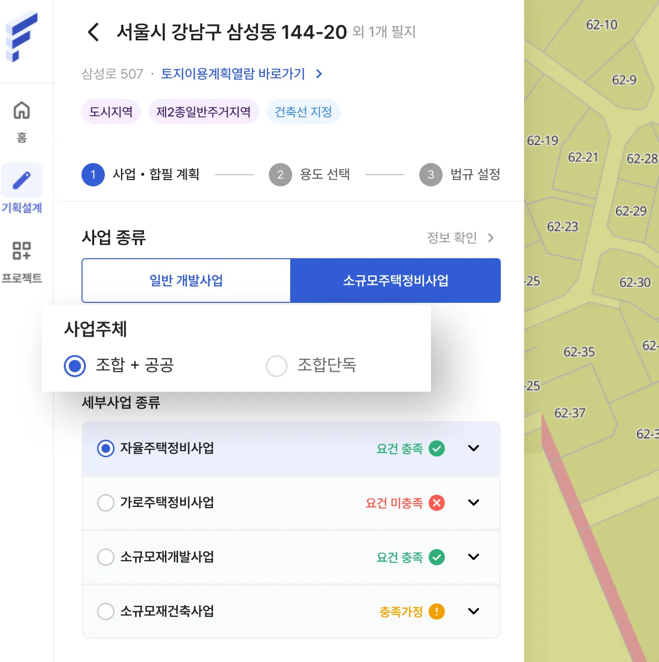 소규모주택정비사업은 사업주체에 따라 적용되는 법령이 달라집니다. 플렉시티는 이번 업데이트를 통해 아래 두 가지 사업주체를 선택할 수 있도록 개선했습니다.