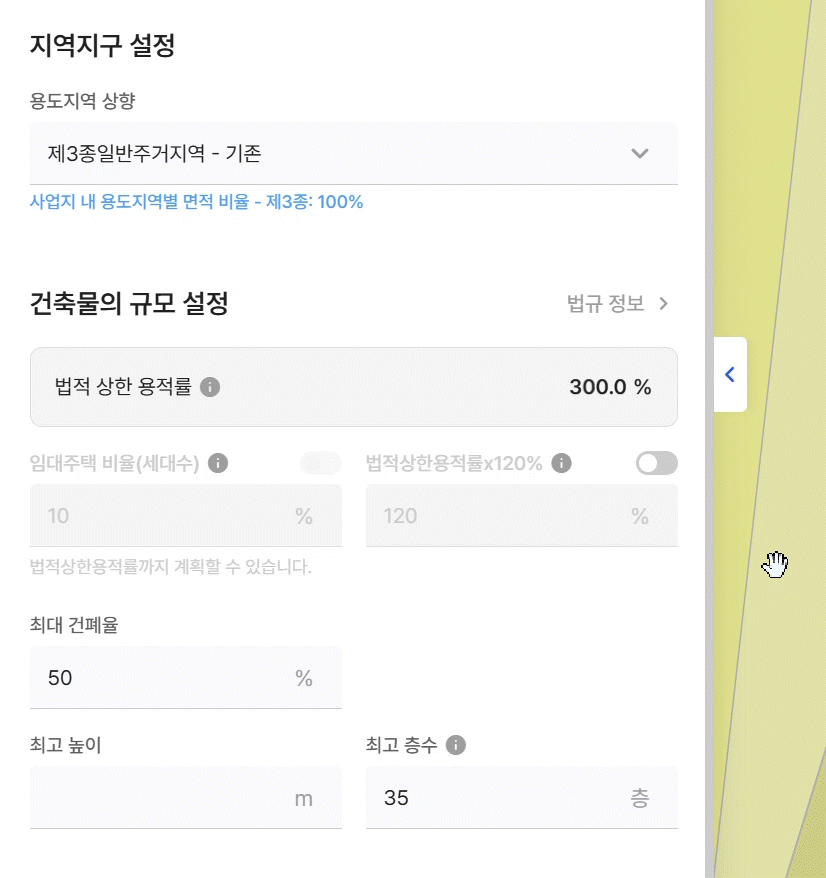 이제 법적 기준에 맞는 완화 적용 시나리오를 검토할 수 있으며, 완화 적용 여부에 따라 달라지는 개발 규모도 쉽게 확인할 수 있습니다.