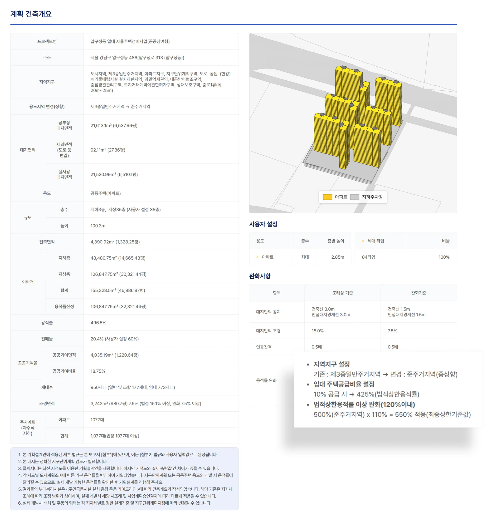 배치안, 면적, 법적 조건, 완화 적용 내용 등을 리포트에서 종합적으로 확인할 수 있어 사업 초기 검토와 판단에 더욱 편리하게 활용할 수 있습니다.