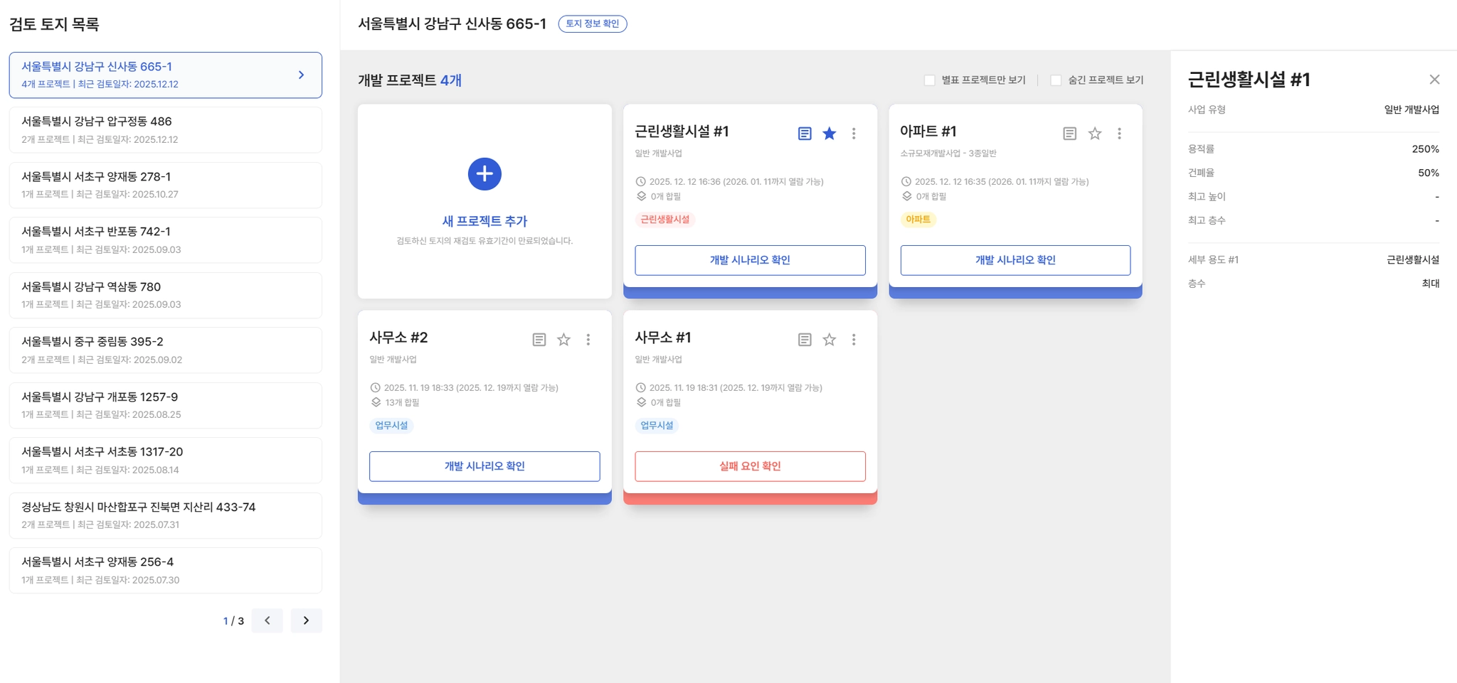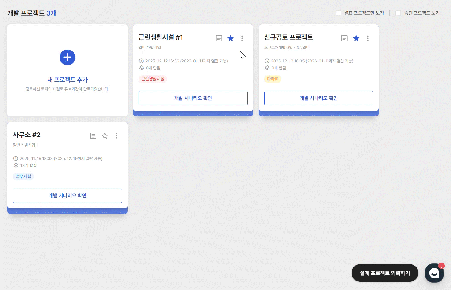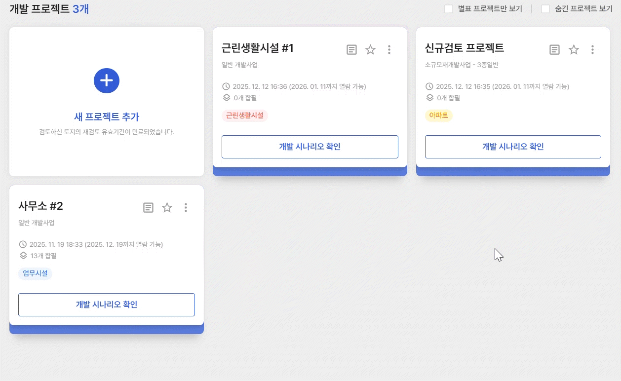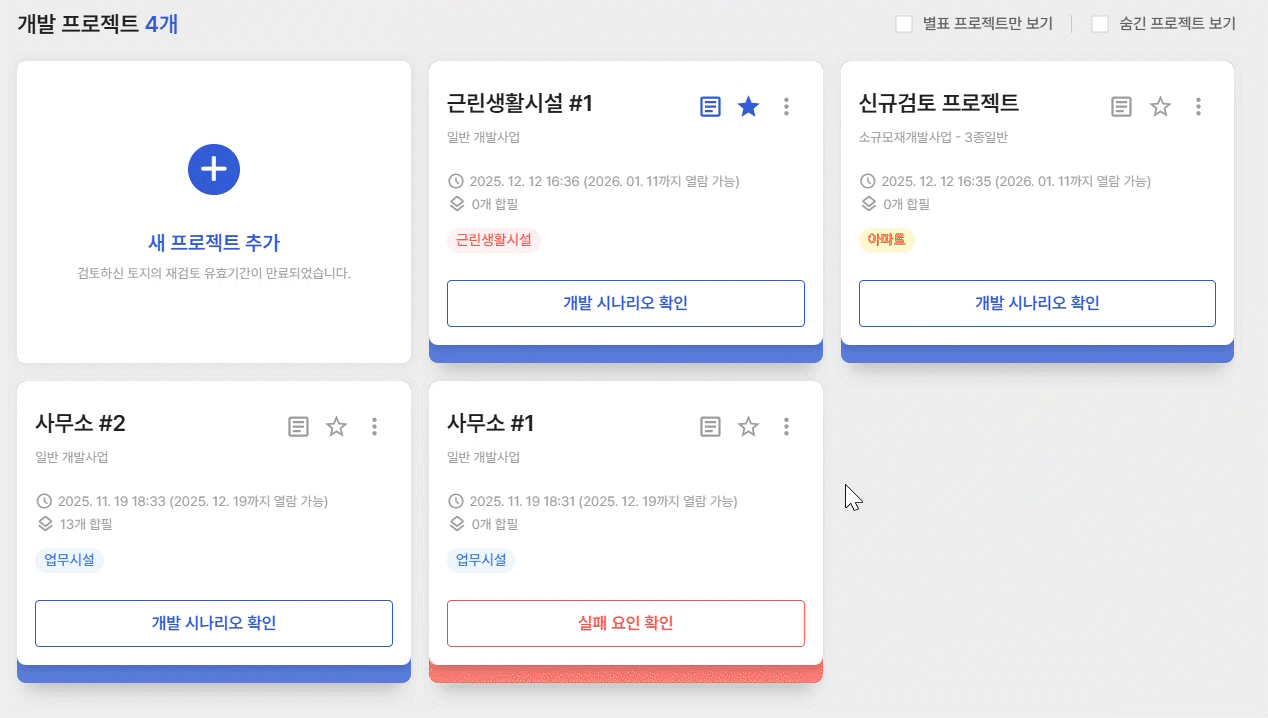 테스트 목적이었거나, 법규·사업성 검토 과정에서 제외된 프로젝트 카드는 목록에서 숨길 수 있습니다.