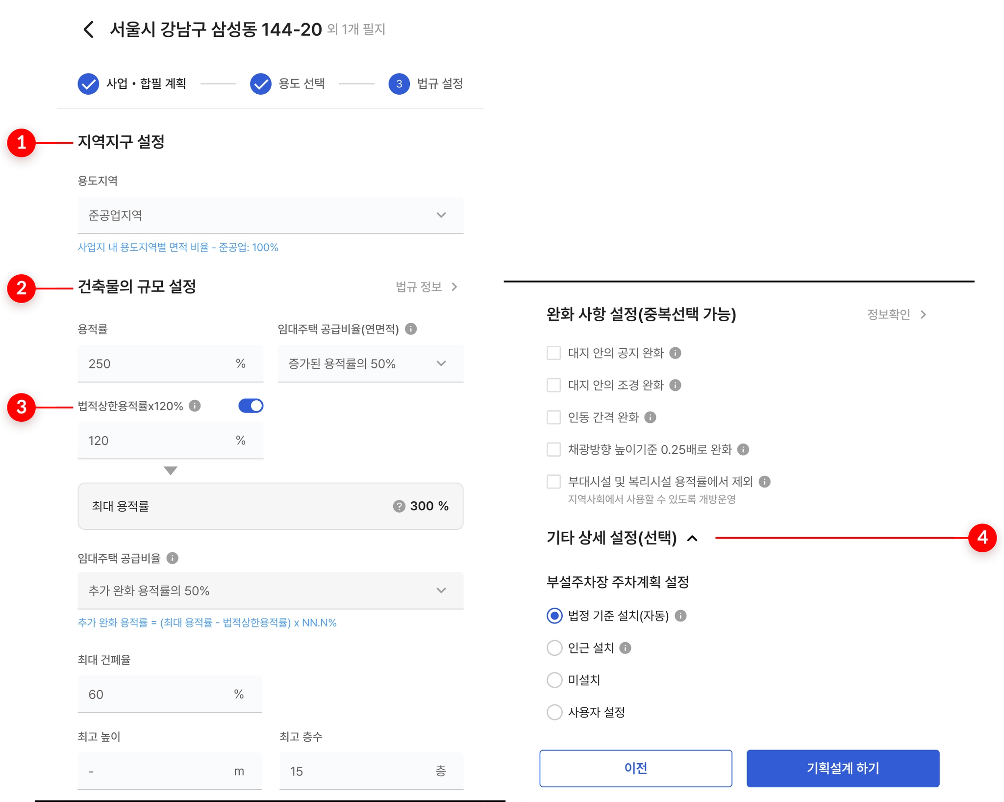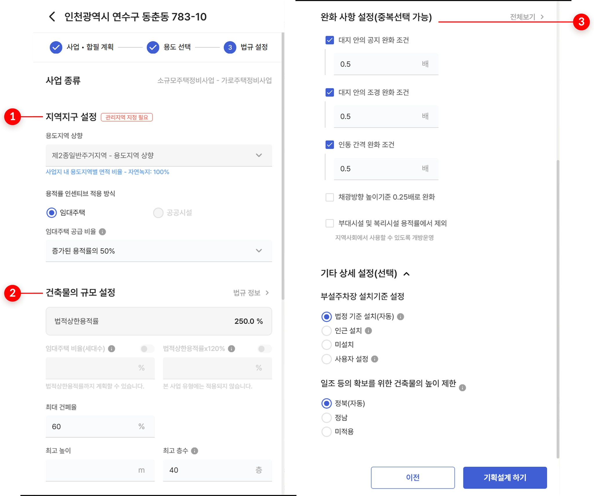 완화 사항 설정 및 기타 상세 설정은 기존 일반주거지역 내 사업 진행할 때와 동일하게 적용됩니다.