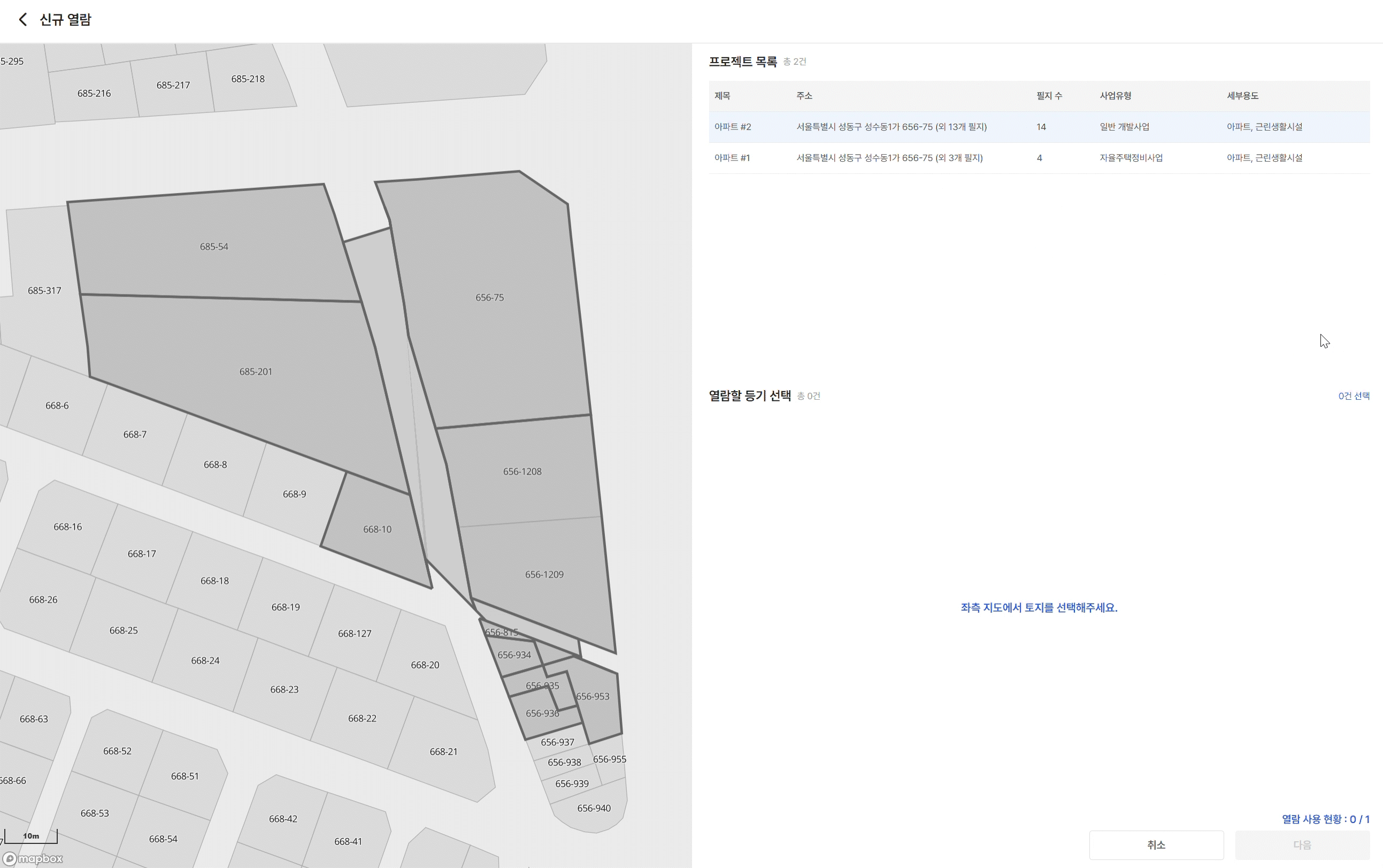 프로젝트를 선택한 후, 지도에서 등기부등본을 확인할 필지를 선택하면 해당 필지에 대해 발급 가능한 등기부등본 목록이 자동으로 나타납니다.