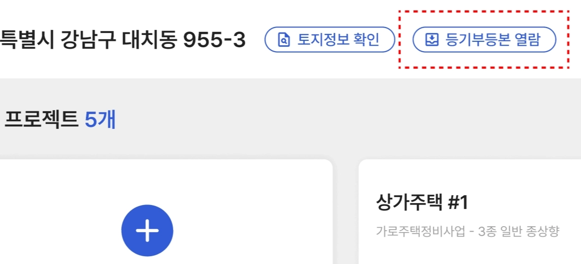 프로젝트 페이지 상단에 ‘등기부등본 열람람’ 버튼이 추가되었습니다.