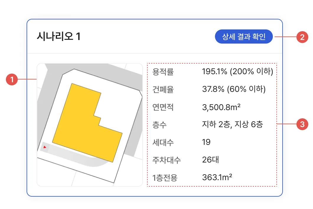 해당 시나리오의 용적률, 건폐율, 연면적, 층수, 세대수, 주차대수를 확인할 수 있습니다.
