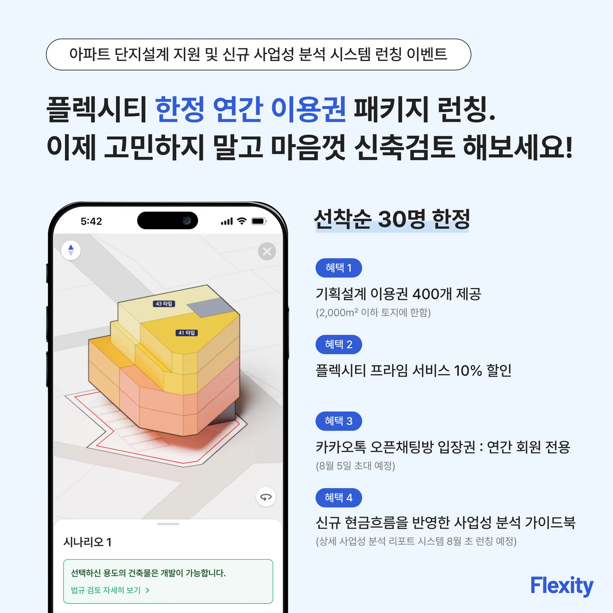 안녕하세요. 빠르고 효율적인 기획설계 및 사업성 분석 AI 솔루션을 제공하고 있는 플렉시티입니다.