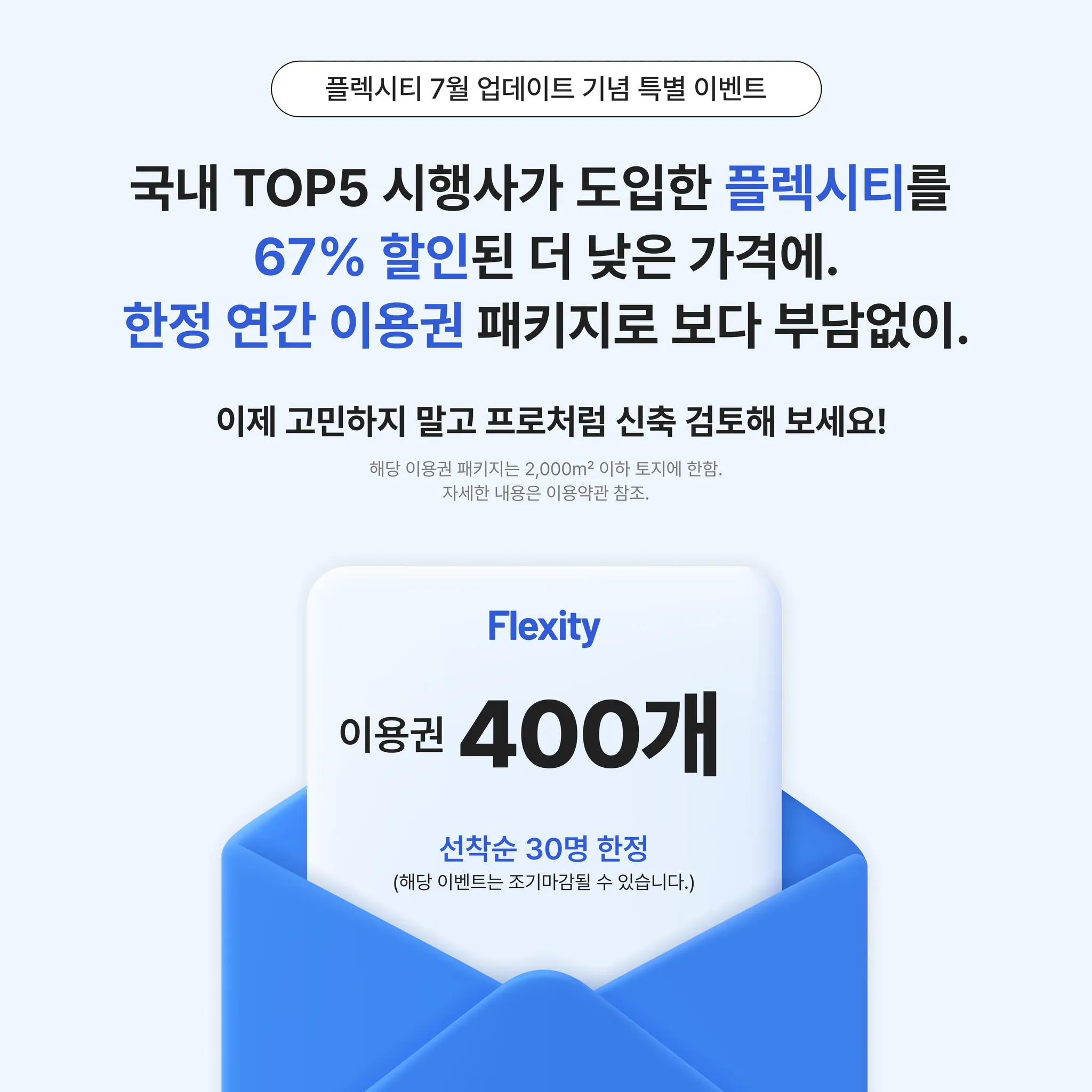 현재 이용권 1개 가격인 7,700원 기준 대비 무려 67%할인된 가격으로 마음껏 신축 검토 해보세요!