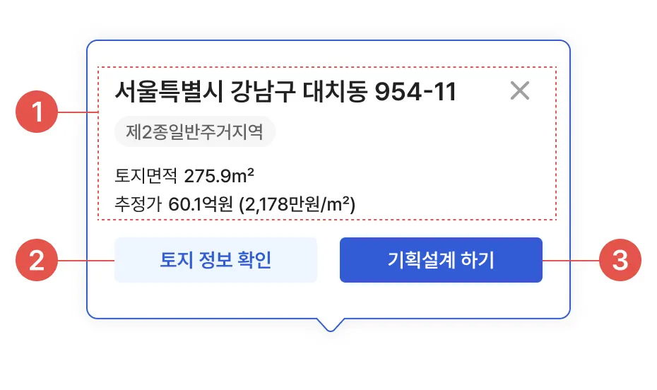 찾은 토지를 클릭하여 간략한 토지 정보를 확인하고, 자세한 토지 정보를 확인하거나 바로 기획설계를 할 수 있는 페이지로 이동합니다.