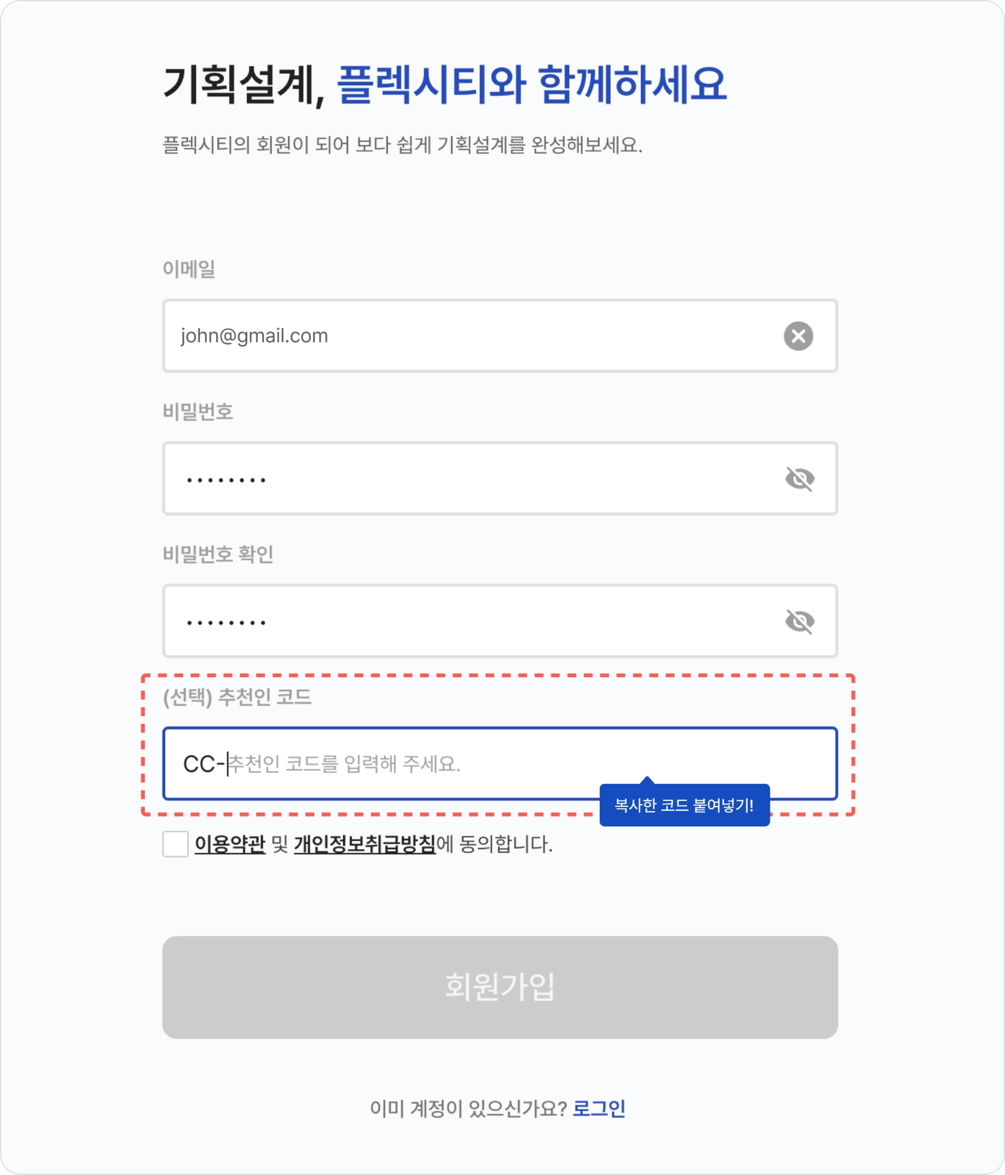 하나. 플렉시티 로그인 후 '계정' > '친구 초대 이벤트' 메뉴에 있는 초대 코드 복사