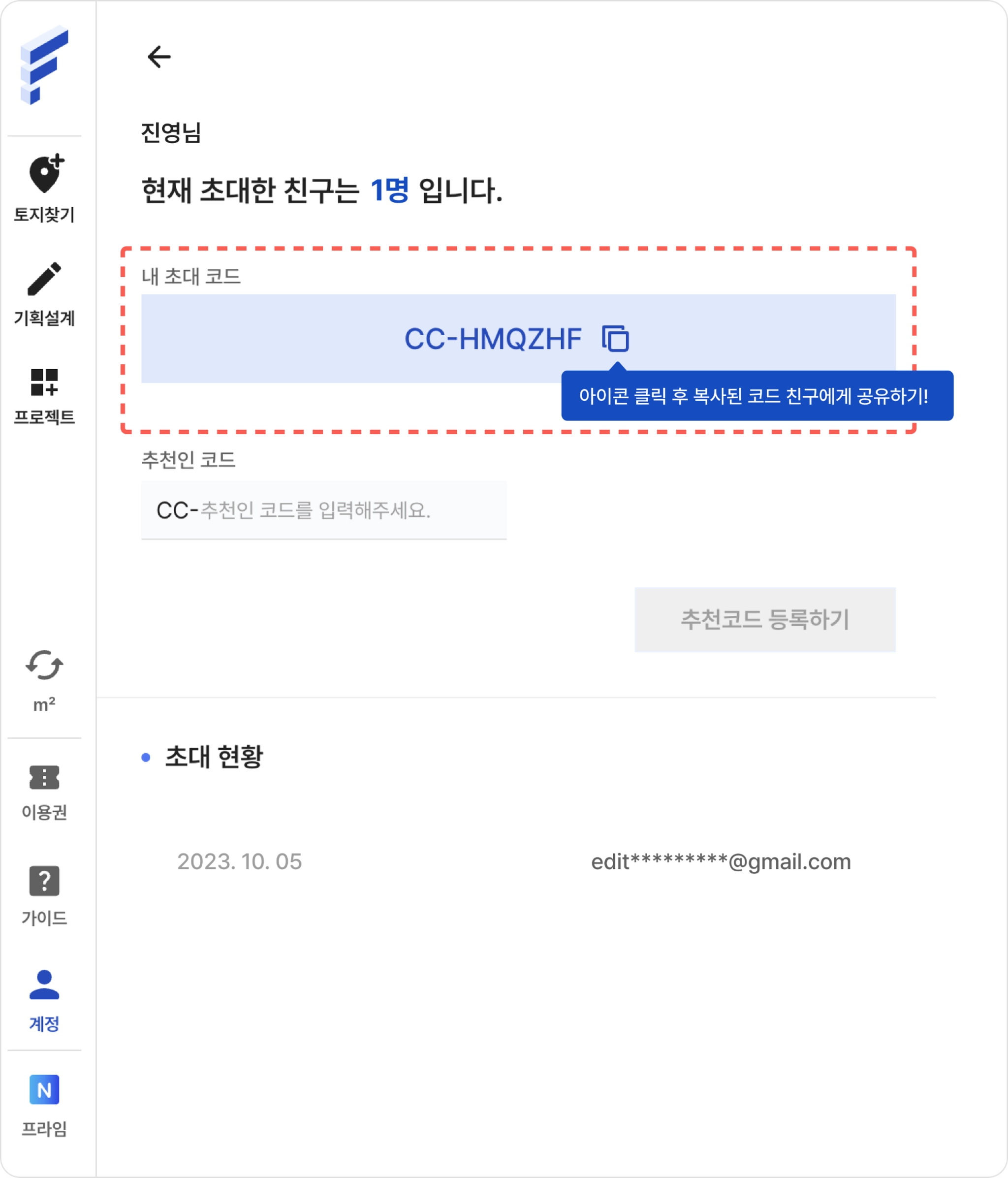 친구가 초대 코드를 입력하면 나도 기획설계권이 1개 무료! 친구도 기획설계권을 1개 무료로 받게 됩니다!