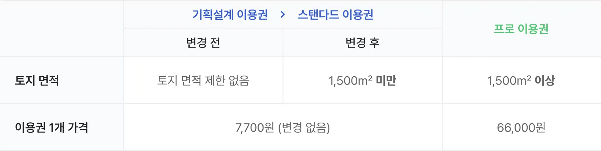 10월 22일 플렉시티의 기획설계 이용권 가격이 검토 토지 면적(1,500m² 이상) 기준으로 변경됩니다.