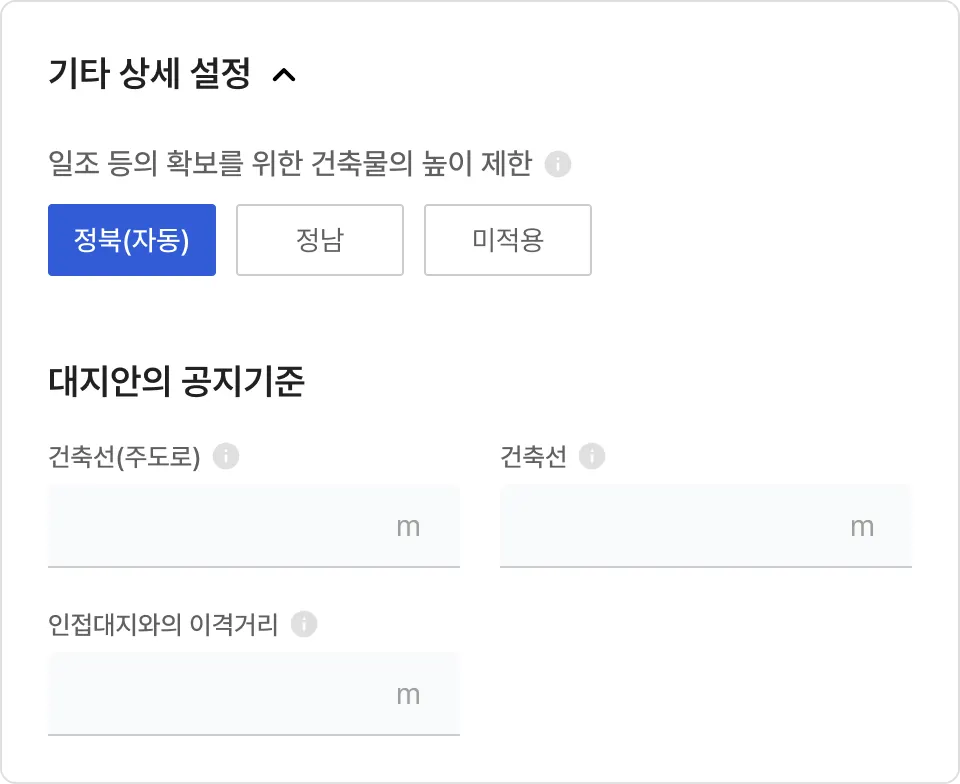 대지안의 공지 건축선(주도로), 인접대지와의 이격거리를 변경할 수 있습니다.