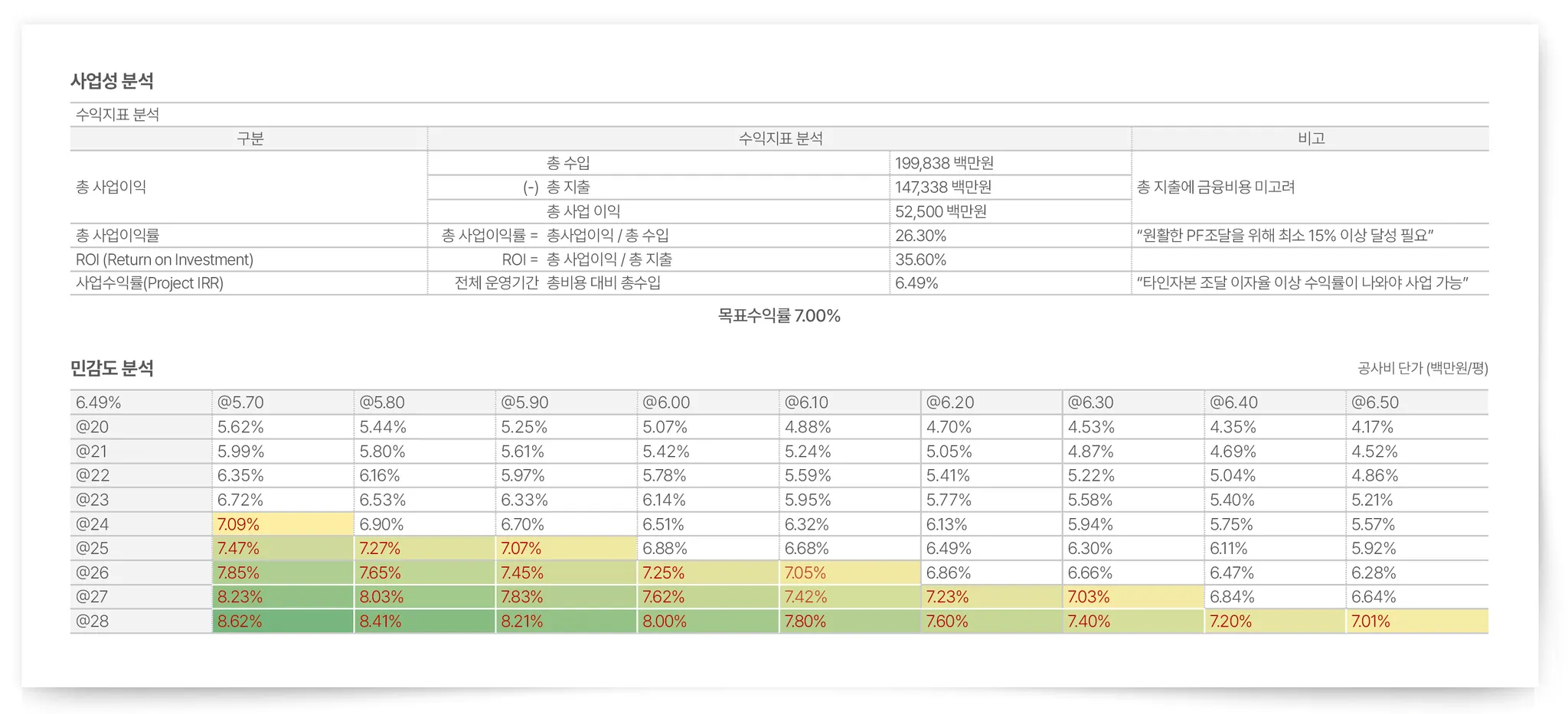 신축개발 후 “즉시 매각”과 “운영 후 매각” 등의 개발 시나리오에 대한 개발 투자 모델링을 기반으로 전문 사업성검토 보고서 전달드립니다.